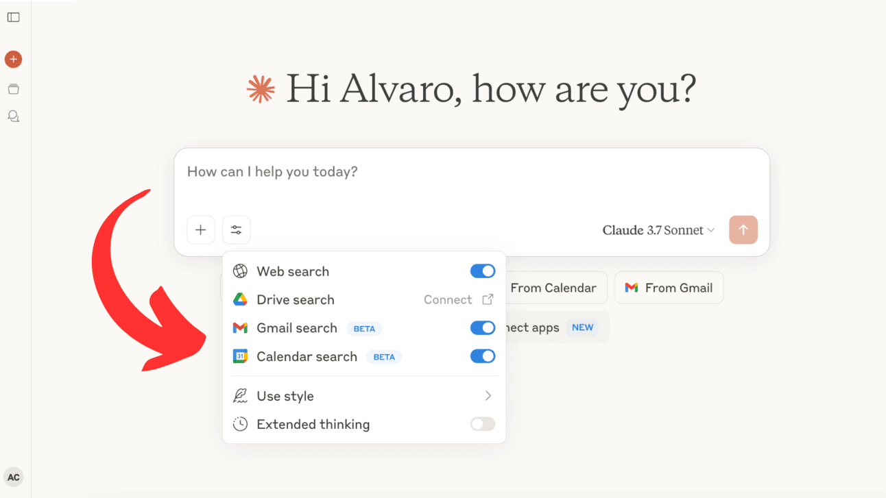 Head over to Claude and click the settings menu to toggle Gmail and Calendar search.